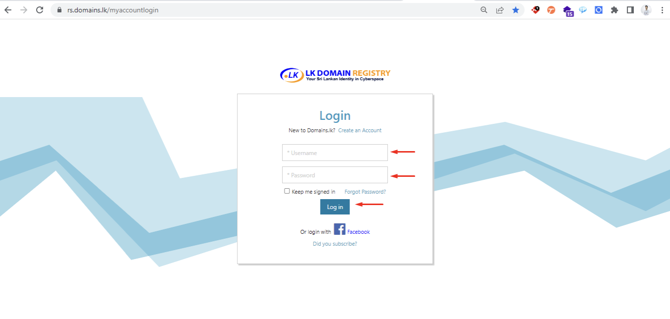 - මෙමගින් ඔබව ඩොමේන් නාම කලමණාකරණය සඳහා .LK ලියාපදිංචි ආයතනය මගින් ලබාදී ඇති ගිණුම වෙත ගෙනයනු ඇත. ඔබගේ ඩොමේන් නාම කළමනාකරණ ගිණුමට අදාල තොරතුරු ඇතුලත් කර ඔබගේ ගිණුමට පිවිසෙන්න.