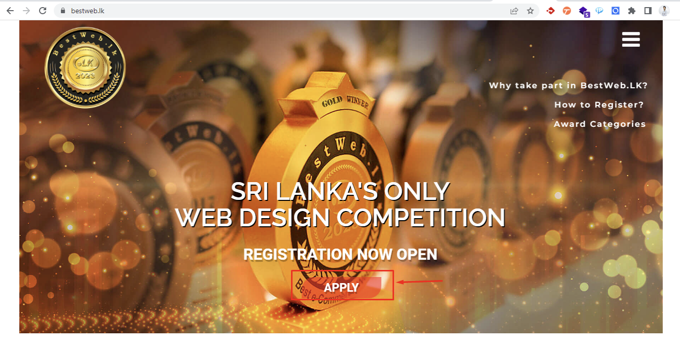 - ගිණුමට පිවිසුනු පසු එහි ප්රධාන පිටුවෙහි (Dashboard) ඇති රූපයේ ඇති පරිදි Bestweb.lk තරඟයට ඇතුලත්වීමේ කොටසෙහි Apply Now බොත්තම භාවිතා කර ලියාපදිංචි වීමේ පිටුවට පිවිසෙන්න.