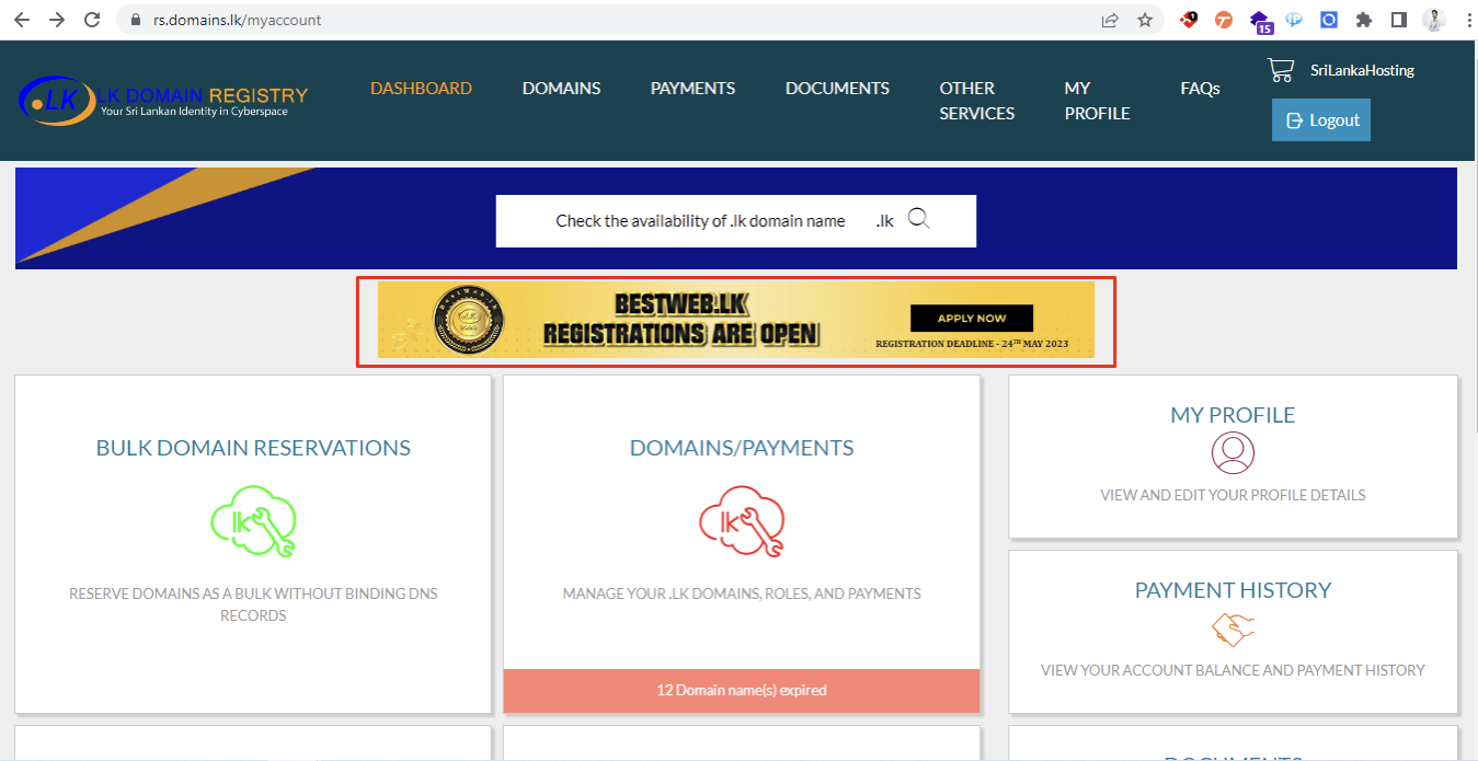 ශ්රී ලංකා ඩොමේන් නාම ලියාපදිංචි ආයතනය මගින් පවත්වනු ලබන Bestweb.lk තරඟාවලිය සඳහා ඇතුලත්වීමට .LK ඩොමේන් නාමයක් හා වෙබ් අඩවියක් හිමි ඔබට දැන් අවස්තාව උදාකර දී ඇත.