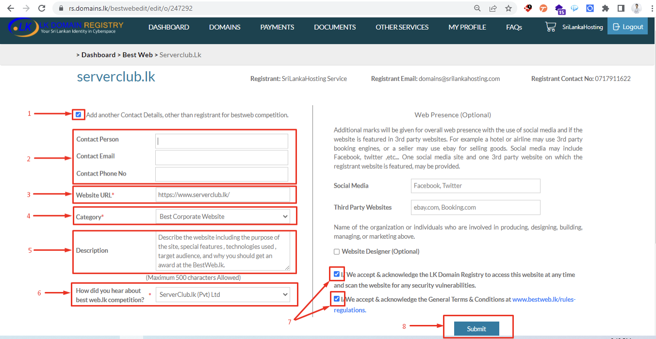 - මෙම තීරුවෙන් ඔබව මෙම තරඟය පිලිබඳ දැනුවත් කල ඇතුලත් කල යුතුය. මේ සඳහා ServerClub.lk (Pvt) Ltd යන අපගේ ප්රධාන ආයතන නාමය හෝ SriLanka Hosting Service යන අපගේ සේවා නාමය ඇතුලත් කරන්න.