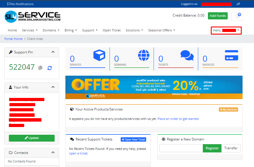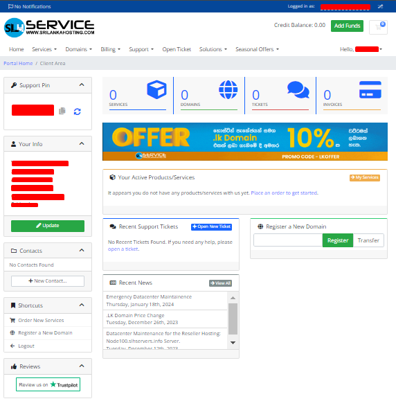 The Client Area at Sri Lanka Hosting is your main hub for managing all your hosting services, domains, and account details. Here, you can easily access your active services, view and pay invoices, manage your domains, and get support. It provides a simple dashboard where everything you need to manage your web hosting is organized in one place, making it easy to keep track of your account and services.
