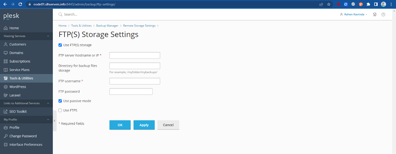 If you plan to use an FTP server to store backup files, it is important to set up the Customer Panel correctly: