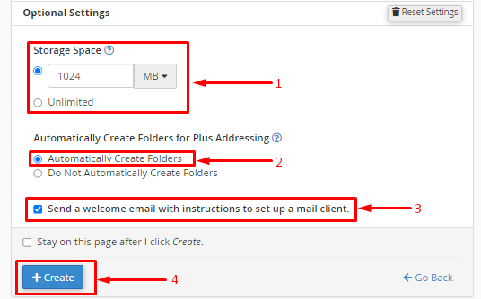 - Select the checkbox to get email configuration settings. (You will receive the email in your webmail account after creating the email)