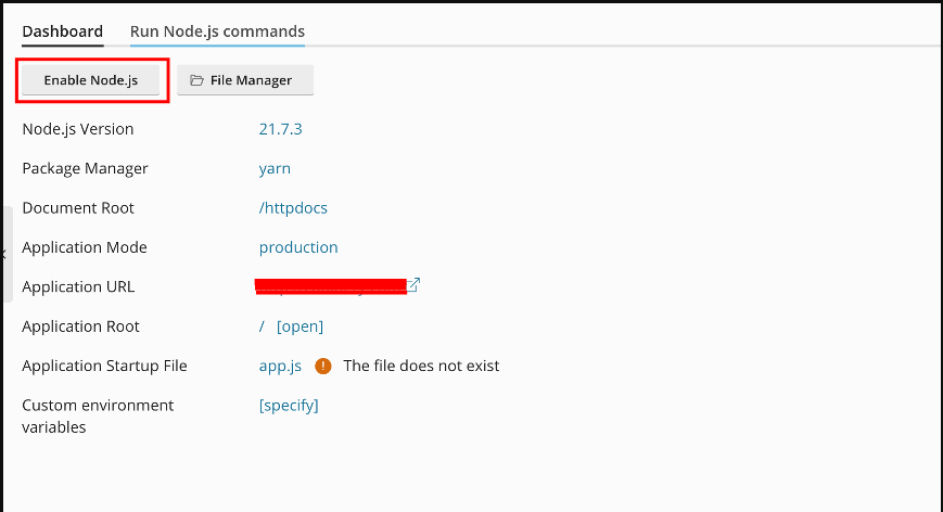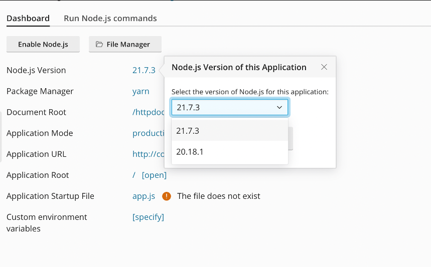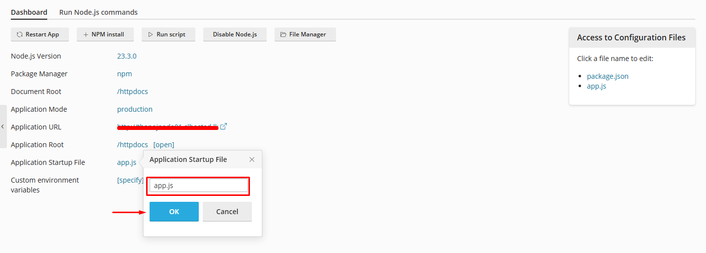 - Specify the file that starts your application (e.g., app.js or server.js) in the Application Startup File field.