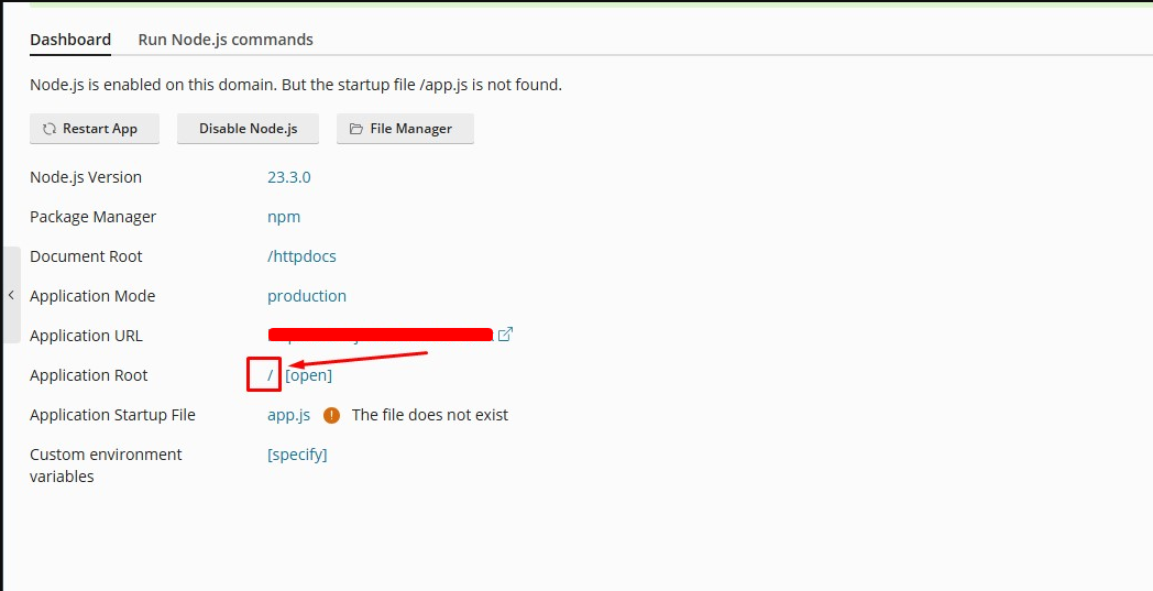 (For example, if your application file app.js is located in the httpdocs directory, select /httpdocs as the location.)