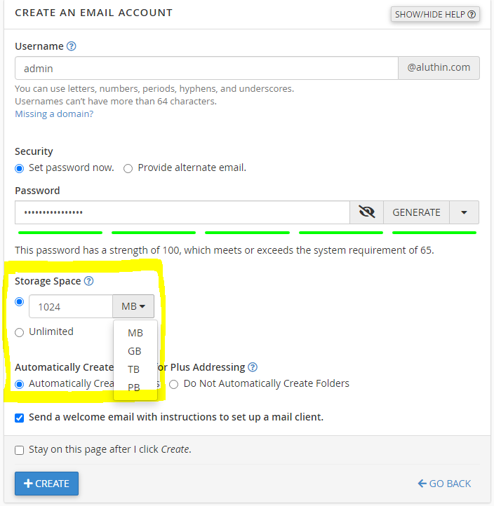 As highlighted in the above image choose the suitable storage space for your mails.