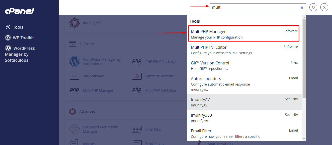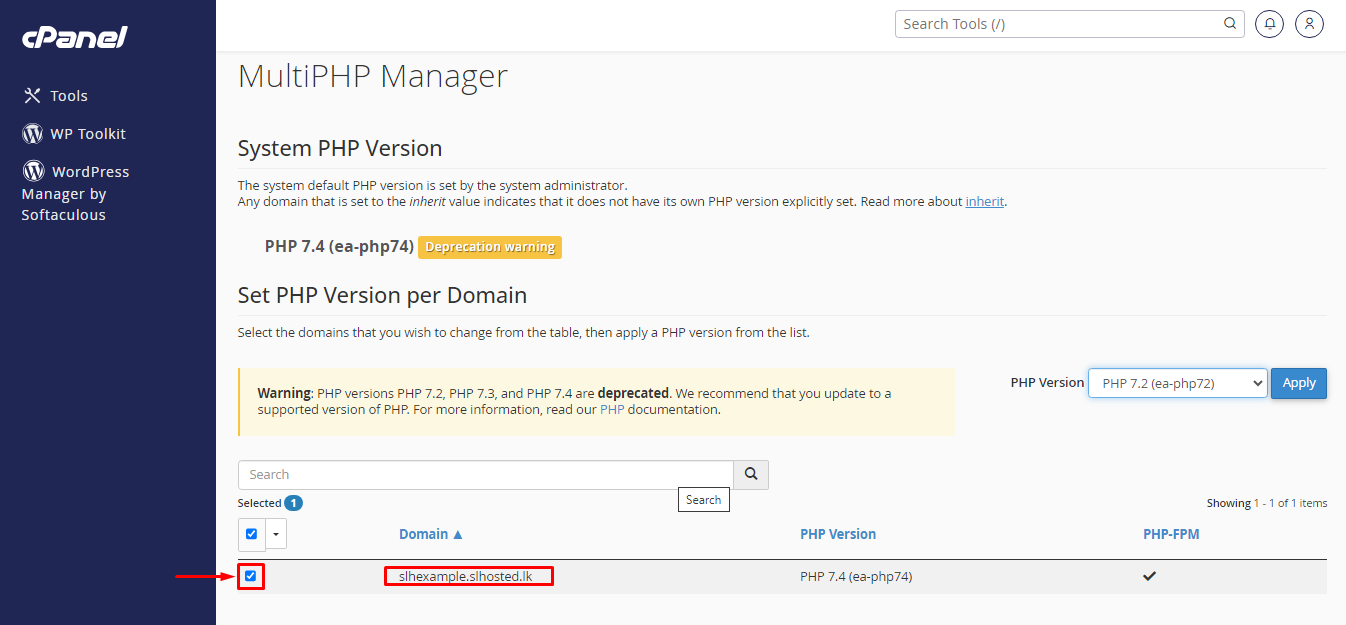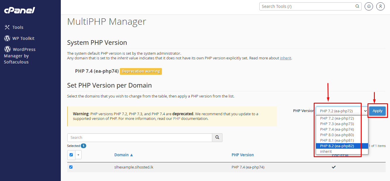 Step 4: Then, Select the Dropdown from the right side to select PHP version and click apply.