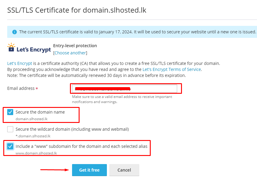 III. Enter your email address and Select the options according to your needs and choose Get it Free to reissue the certificate.