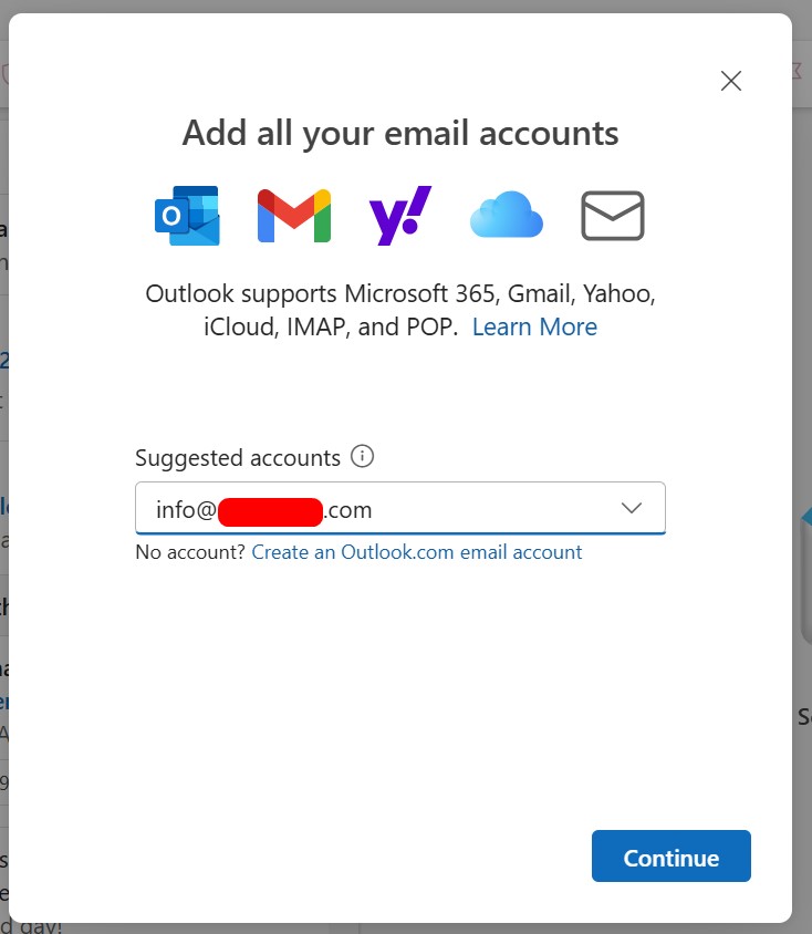 Step 2: In the Add Account window, type your full email and select Continue button