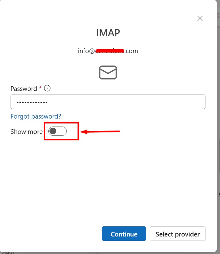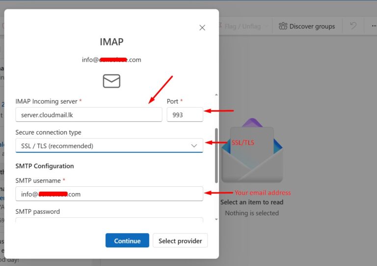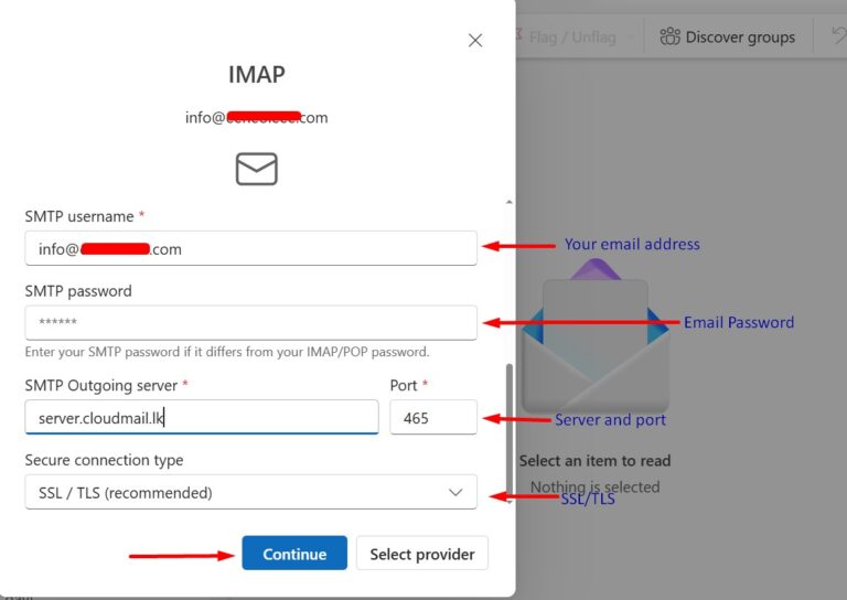 Step 4: Enter your email server IMAP configuration details as displayed in the image below. Once done, click Continue to complete the IMAP configuration.