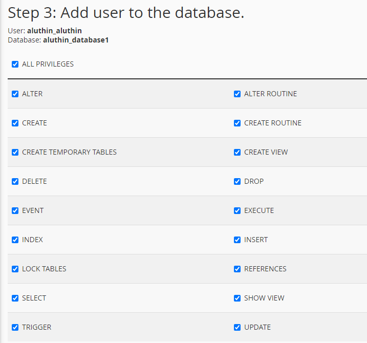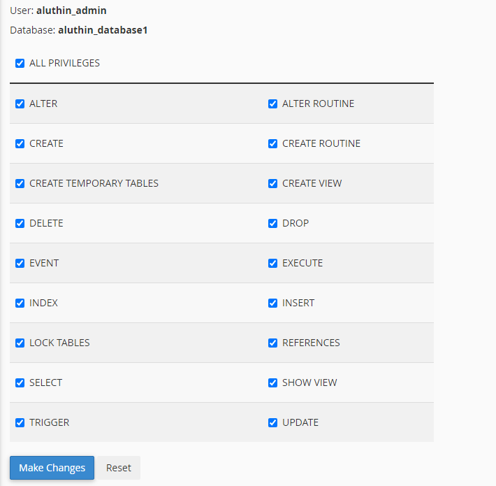 - You will need to set correct privileges to the MySQL User. In the following example, we shall grant all privileges to be able to maintain our MySQLDatabase without any restrictions, so you simply need to choose the All Privileges option and click on the Make Changes button:
