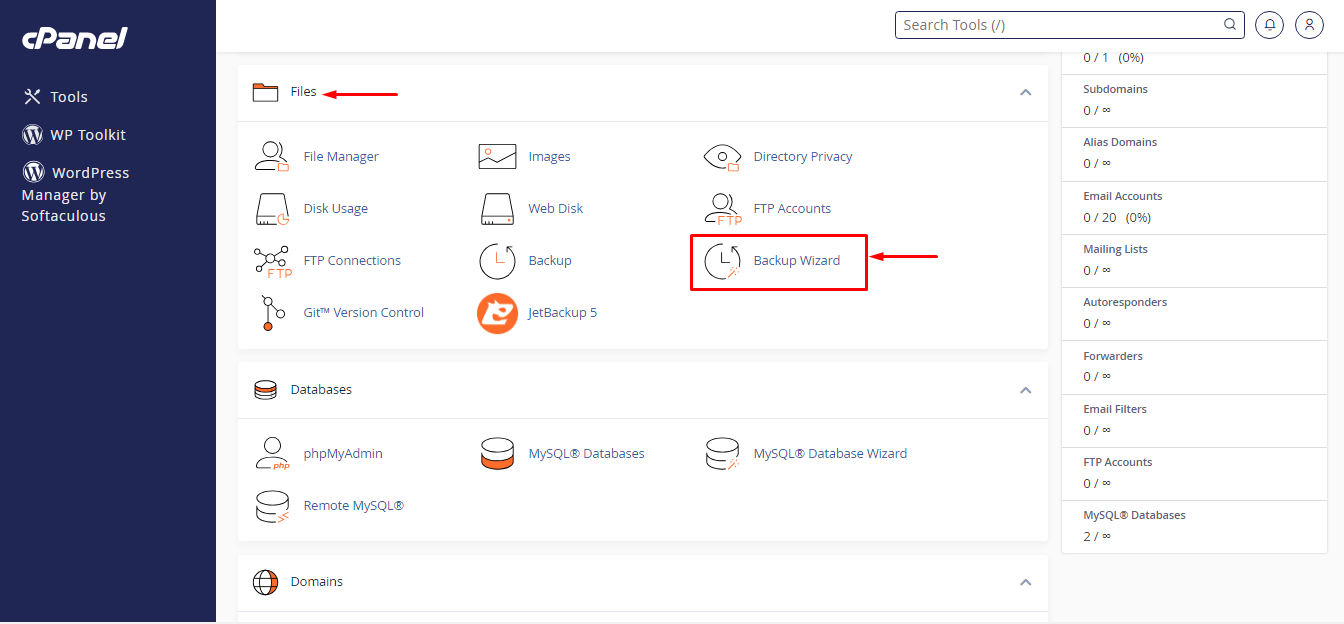 Step 2: Locate Backup wizard under the files section