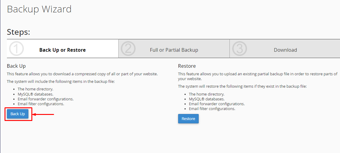 Step 5: Select your backup destination (Home Directory or FTP)