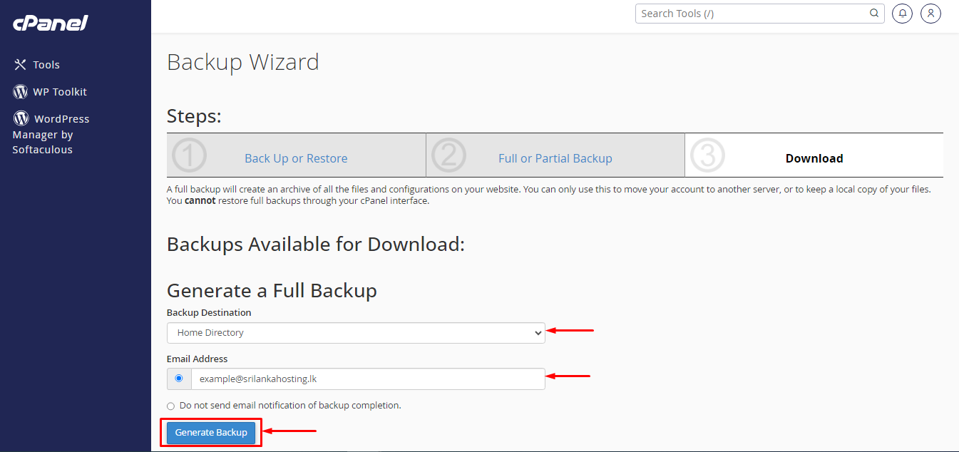 - your email address(if you want to get an email of backup completion), and click generate.