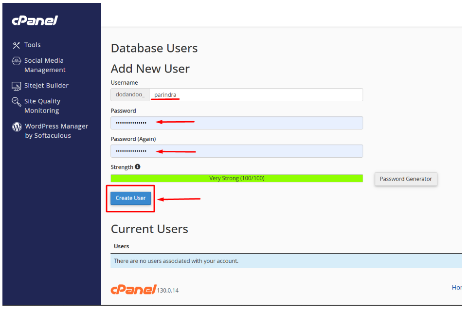 - Enter a username and a strong, secure password (you can use cPanel’s password generator).
