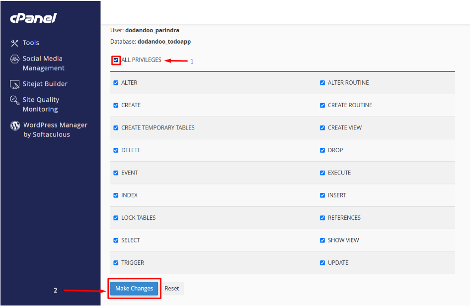 - On the next screen, select ALL PRIVILEGES — this gives your Laravel app full control over the database.