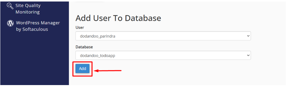 - Under Add User to Database, choose the user and the database you just created.
