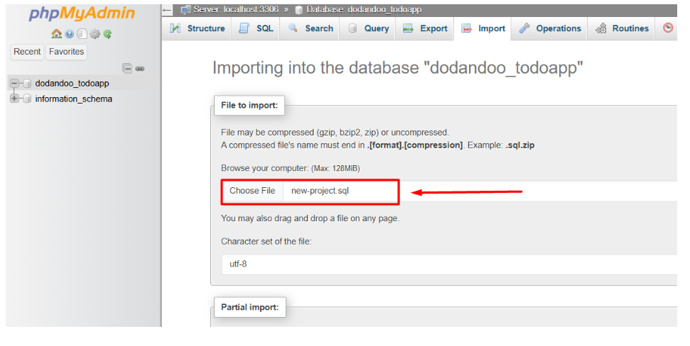 IV. Choose your .sql file and click import to start the upload.
