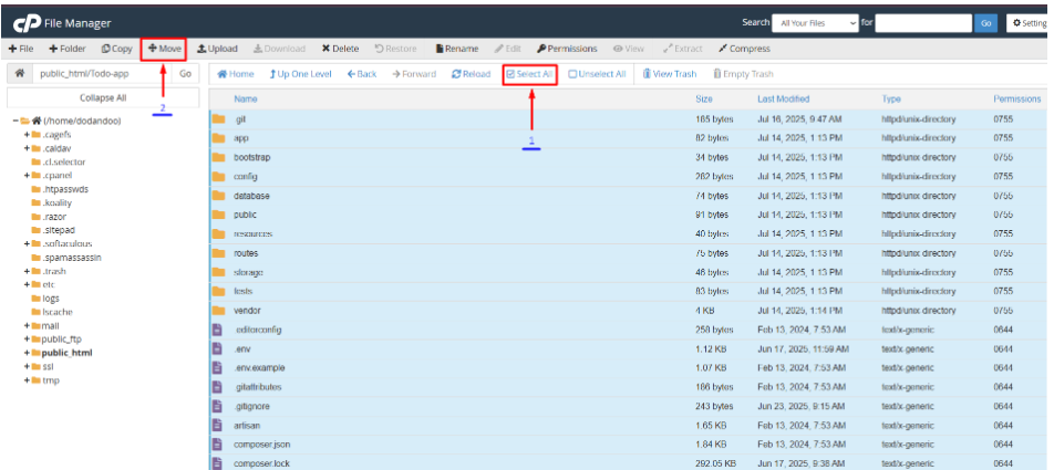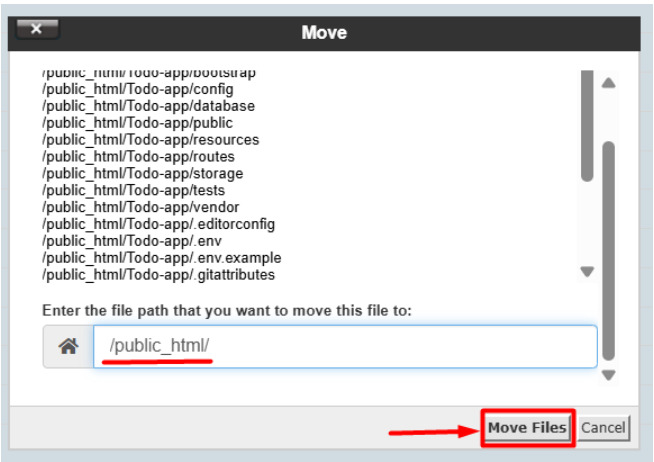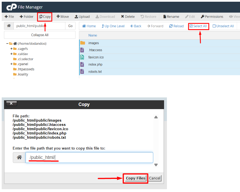 Step 10: After going to the public folder, select All files and copy to the /public_html/ folder