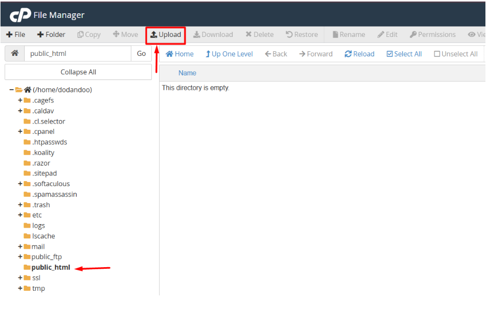 II. Go to the public_html folder and click the Upload button.