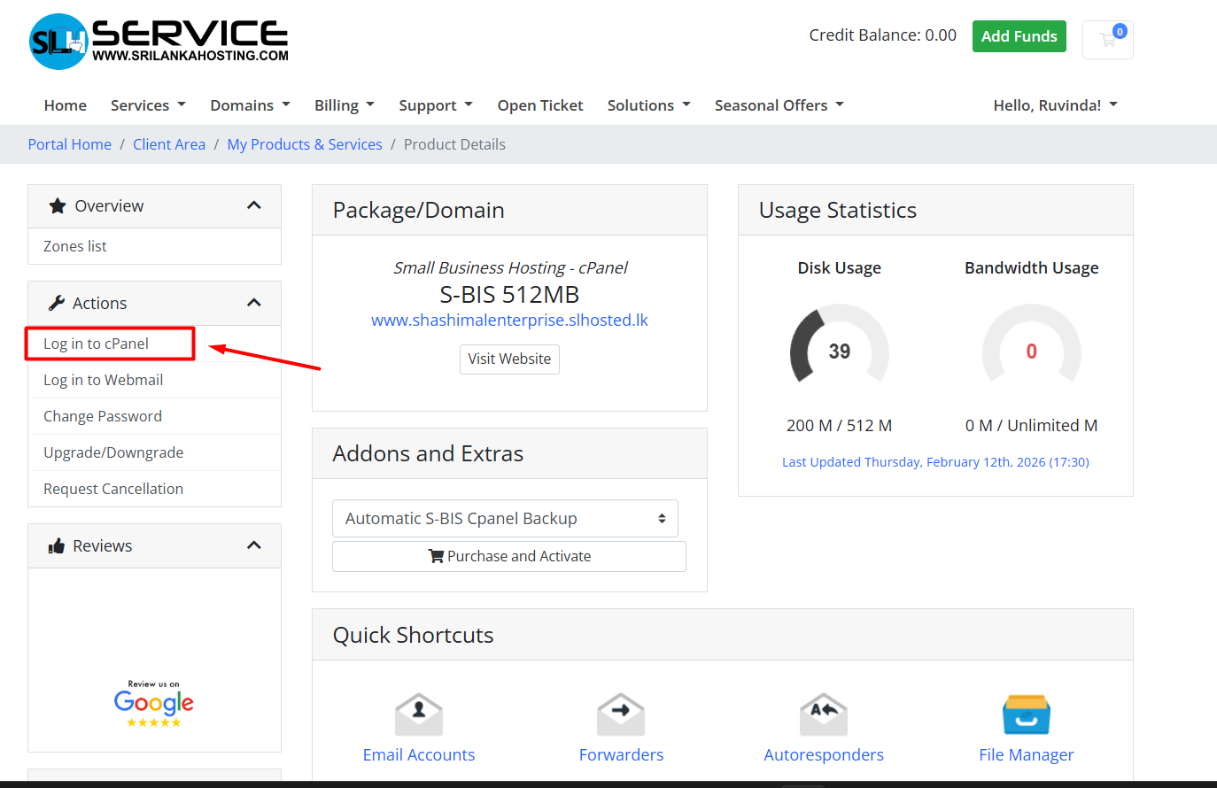 Click on the Login to CPanel to log in to your Cpanel directly.