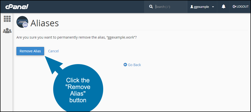 - On the next page, click the Remove Alias button.