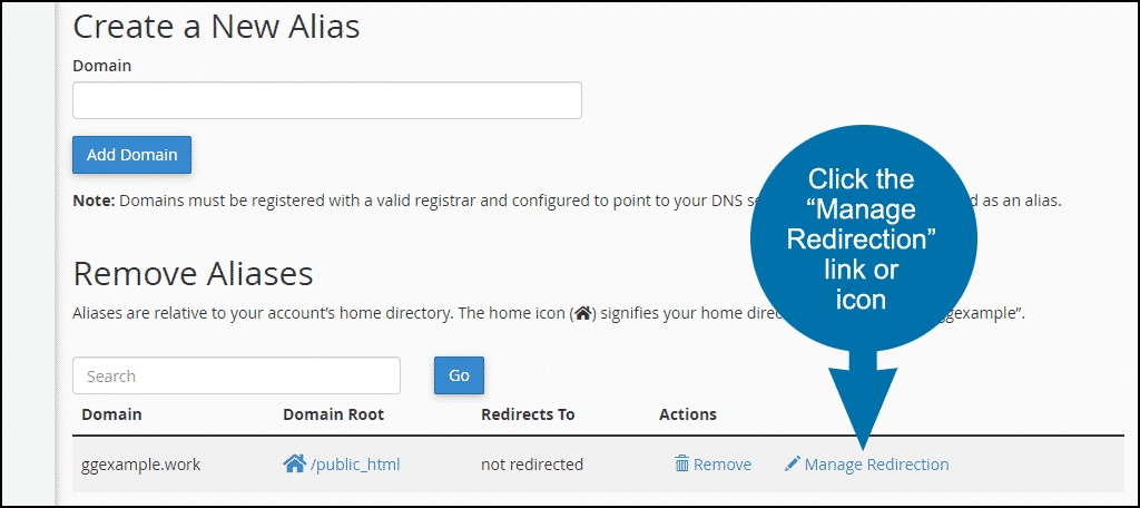 - If for any reason, you wish to redirect the Domain Alias, in the Actions column, click the Manage Redirection link or icon.