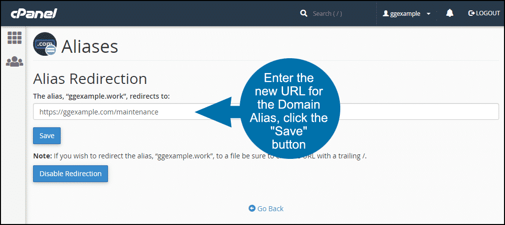 - In the Alias Redirection section, enter the new URL that you wish the Domain Alias to point to.