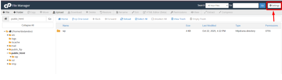 2. In the File Manager, click the “Settings” button at the top-right corner.