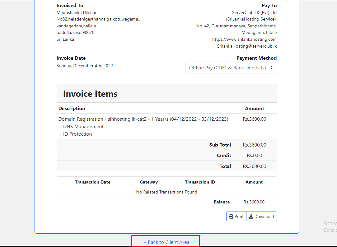 Step 5: Next Click Back to client area