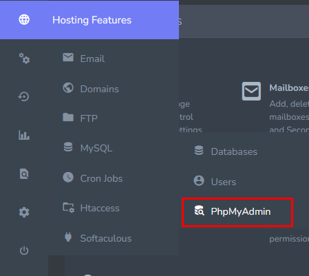 Login to SiteWorxGo to Navigation Sidebar -> Hosting Features > MySQL > PHPMyAdmin, This opens PHPMyAdmin for the domain