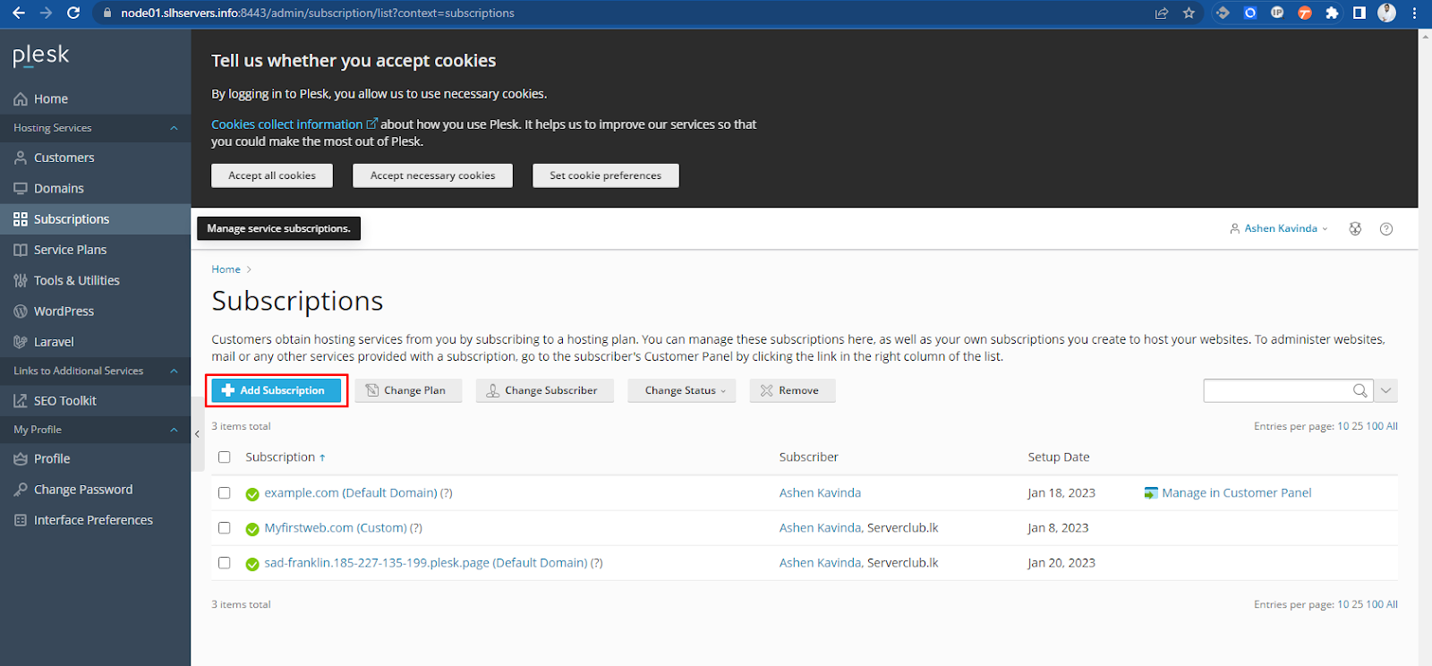 - To suspend or reactivate one or more subscriptions, select the checkboxes next to the names of subscriptions whose status you want to change and click either Change Status -> Suspend or Change Status -> Activate. Note that as long as a subscription is suspended, all websites associated with it are also suspended.