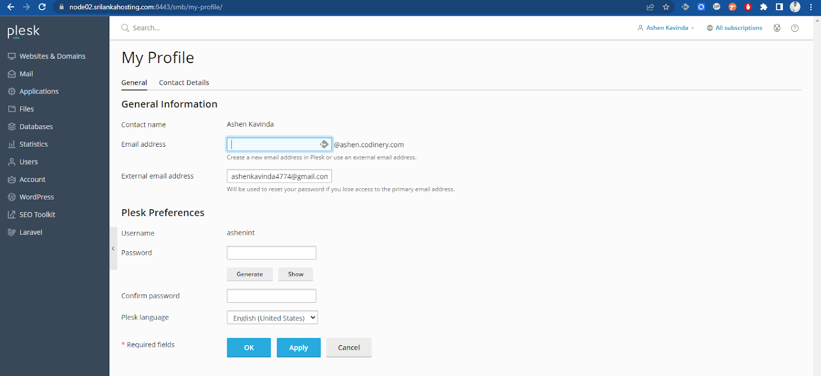Your account in Plesk stores your access credentials and contact information, such as email, address, and phone number. Depending on how you subscribed to a Plesk reseller plan, you may be able to choose your own username and password or receive them from your hosting provider. To change your account password, click the Change Password link in the navigation pane. If you forget your password and are unable to log in to Plesk, click the Forgot Your Password? link on the login page and enter your username and the email specified in your contact information. Upon submitting this information, Plesk will send your password to the specified email address.