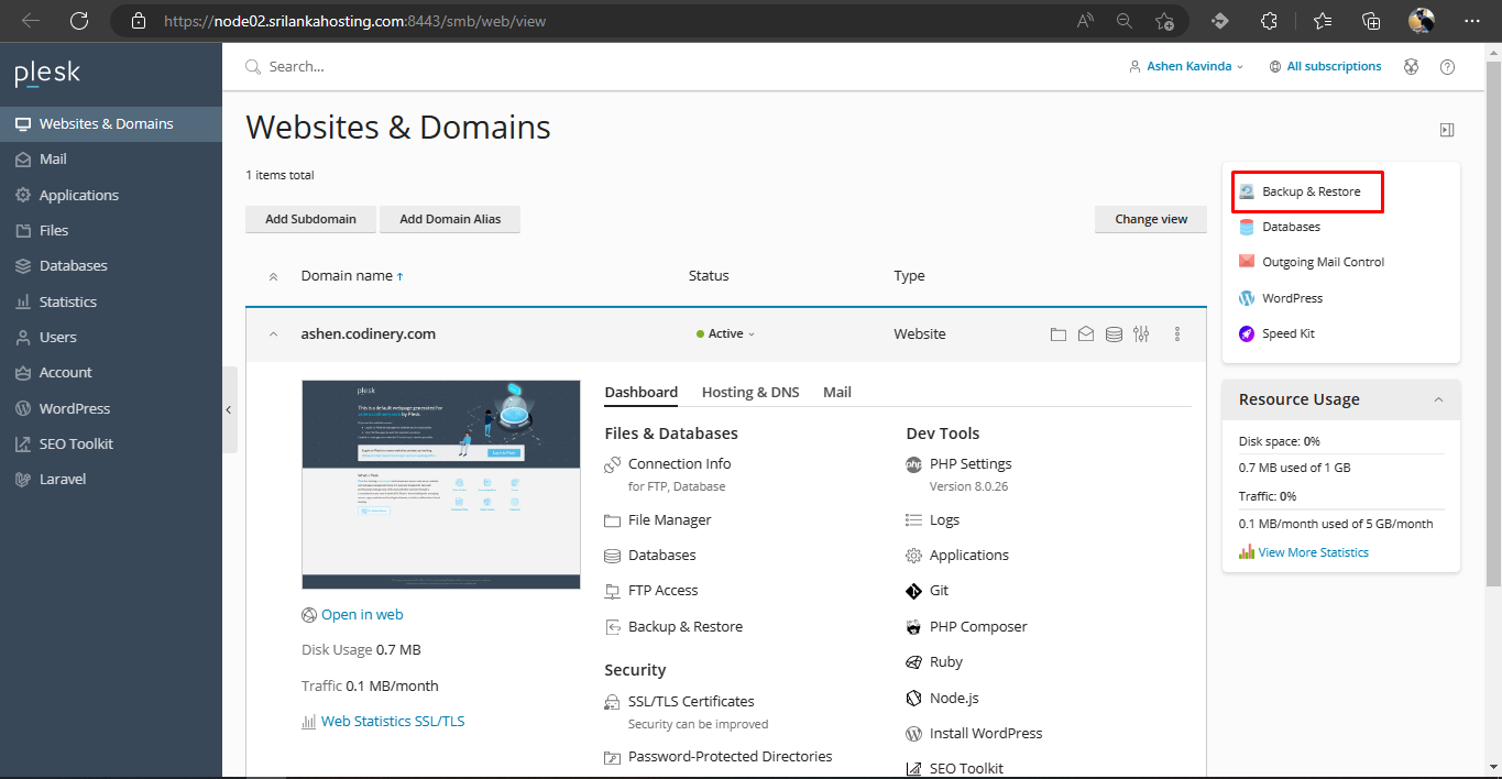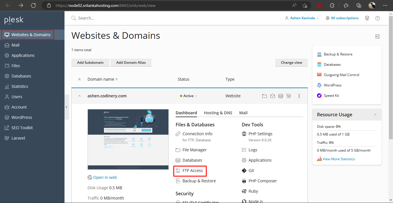 - Log in to Plesk and go to the Websites & Domains section.