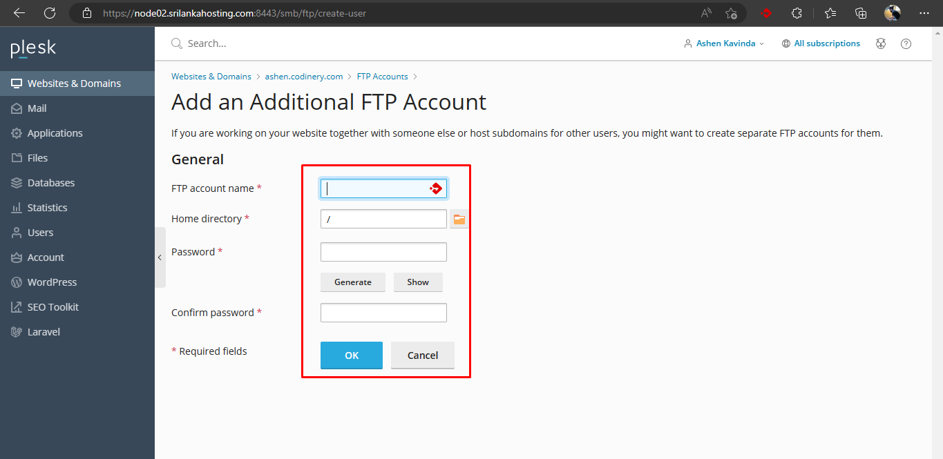 - Click the OK button to create the FTP account.