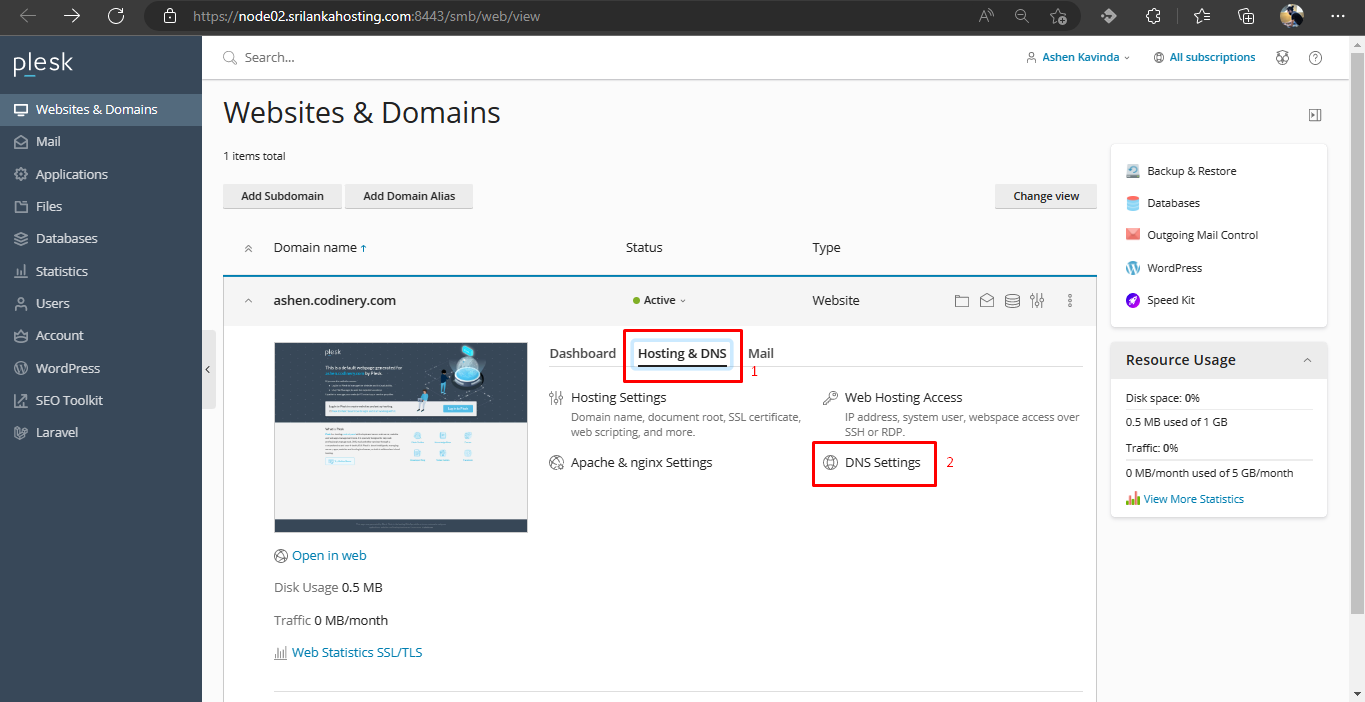 Once the domain has been added, it will appear in the list of domains in the “Websites & Domains” section of the Plesk UI. You can then use the domain to create and manage websites, email accounts, and other resources.