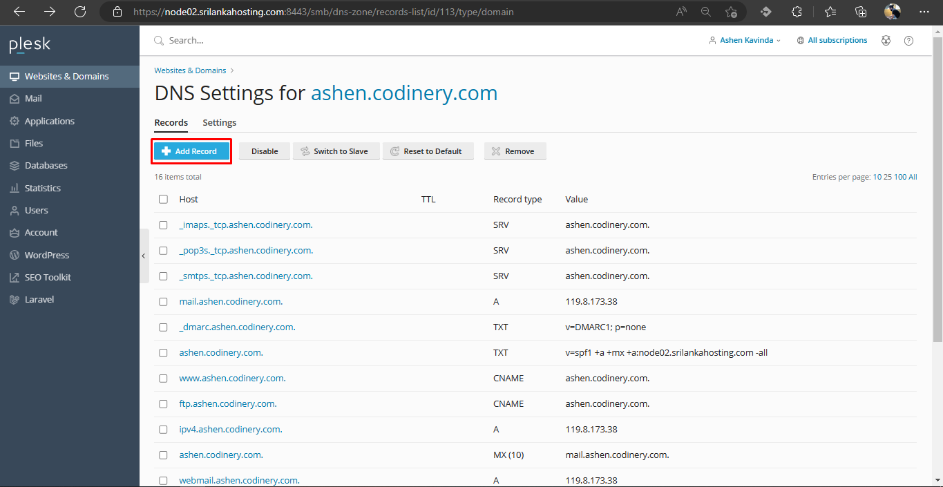- Go to Websites & Domains -> DNS Settings -> Add Record.