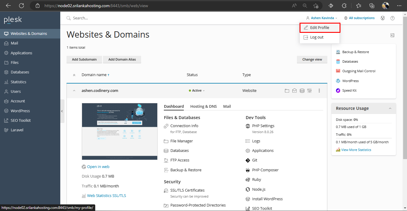 If you are a web hosting customer, it is likely that the password you use to log in to Plesk was set up for you by your hosting provider. To change it, hover your mouse pointer over your user name located at the top of the page and click Edit Profile.
