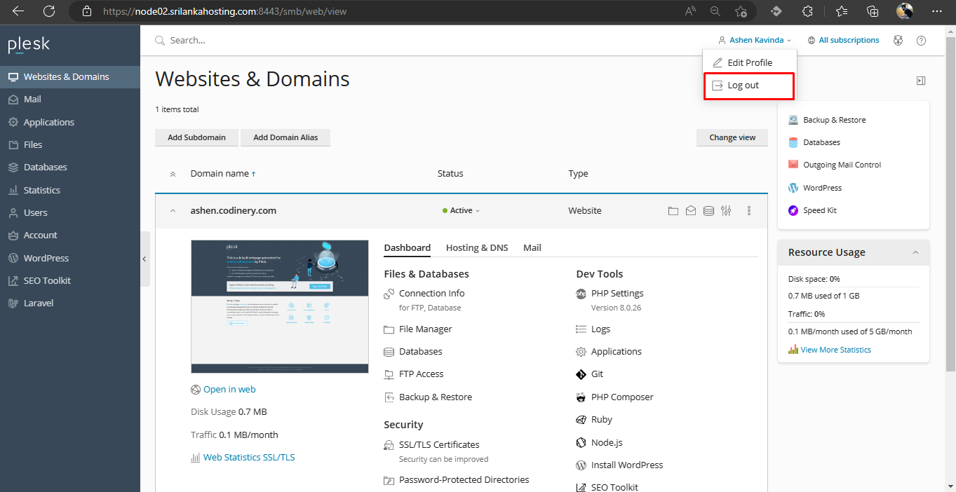Now that we have performed all the desired tasks, it is time to log out of Plesk. Hover your mouse pointer over your user name located at the top of the page and click Log out.
