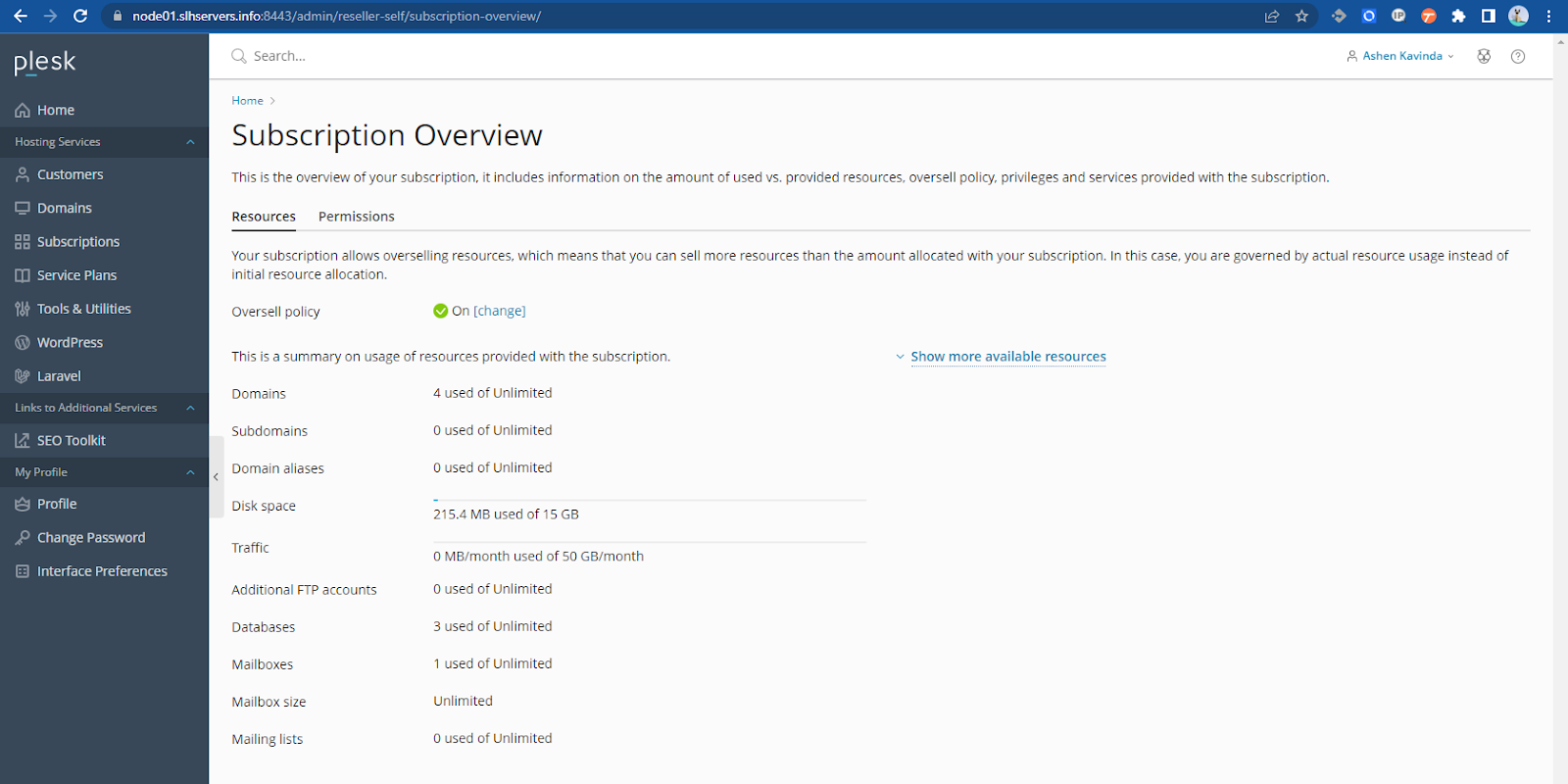 This section lists the Plesk resources that are included in reseller subscriptions. To view the resources allocated for your account, Go to Home -> My Resources and Permissions Overview
