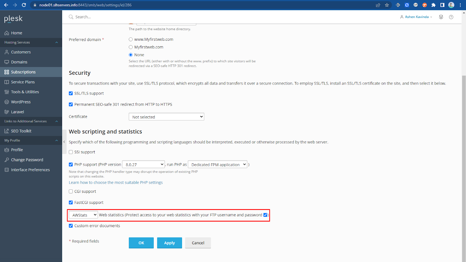 To enable or change the web statistics application, Go to Websites & Domains -> Hosting Settings and in the Web Statistics menu, select the web statistics software you want to use to view graphical reports and charts of website visitors.