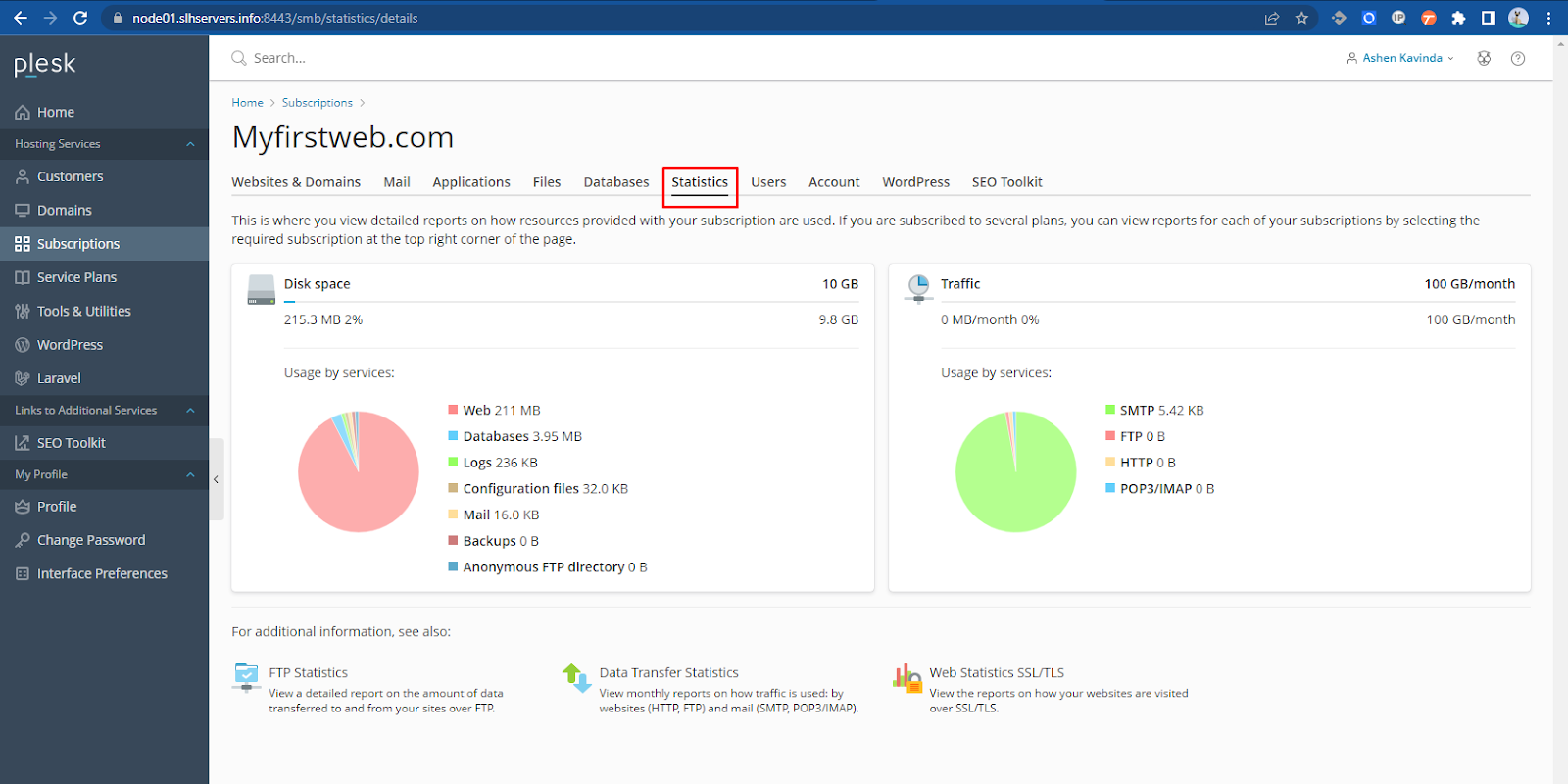 To view the web statistics and reports, Go to Subscription -> Statistics.