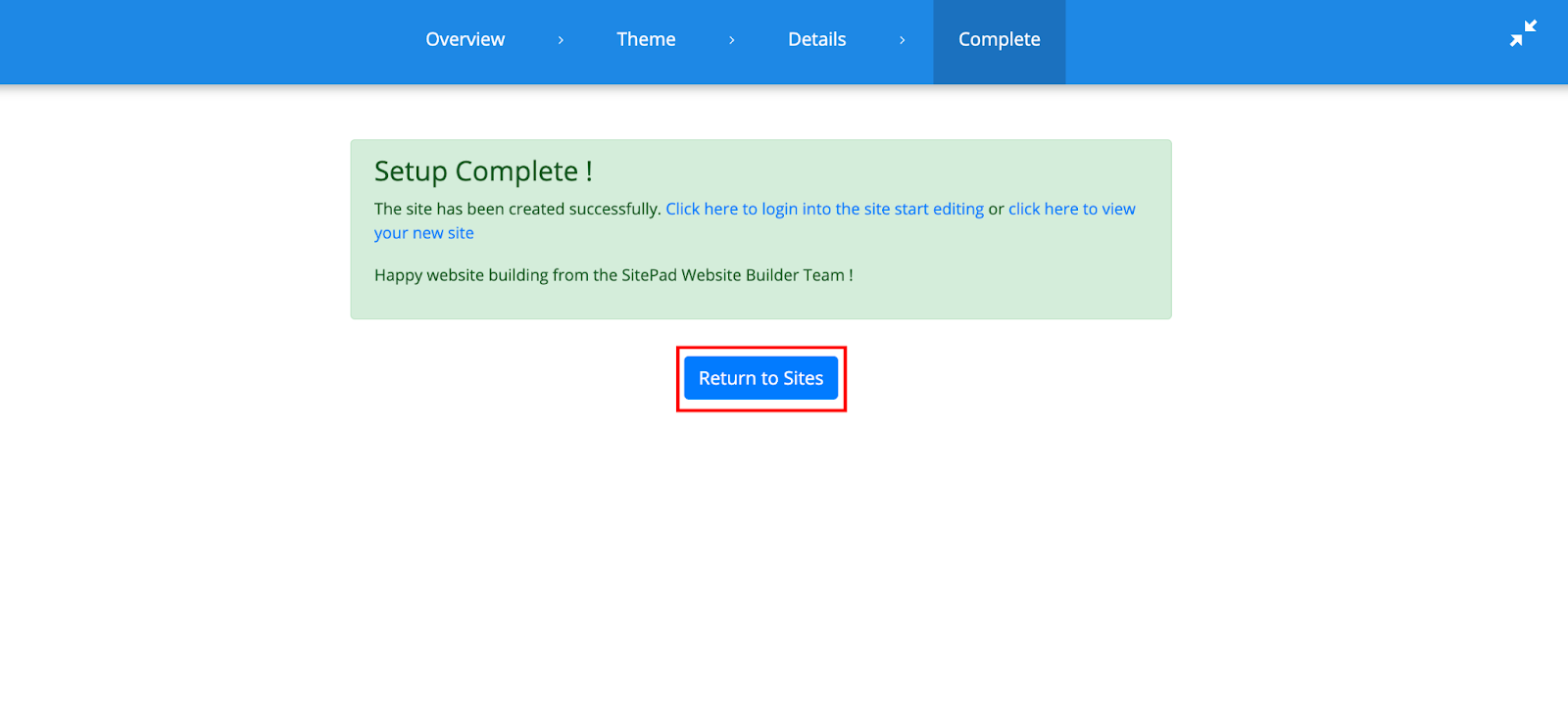 Step 07: You’ll display the below notification when a successful installation. Click Return to Sites to goto your website
