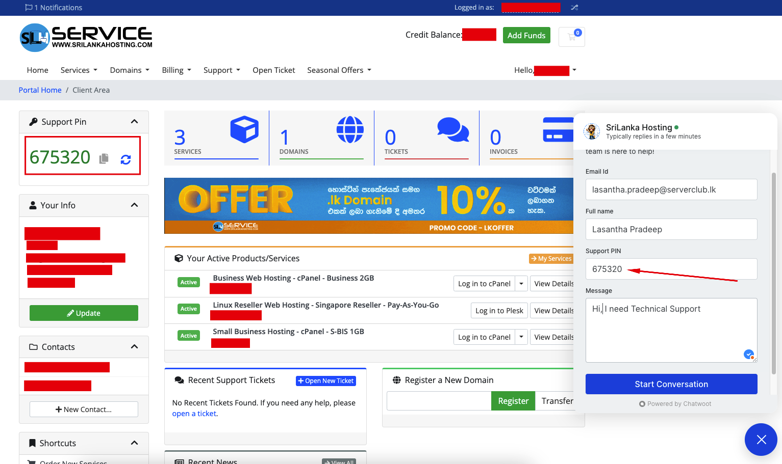 Sri Lanka Hosting Service offers a Support PIN feature for existing clients to obtain technical and billing support for their products via chat, email and call support. This feature enables agents to easily verify client accounts and address issues directly related to those accounts.
